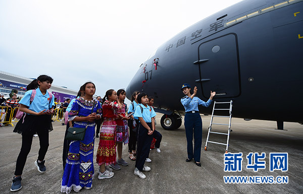 藍(lán)天春蕾女童在航展現(xiàn)場參觀(11月10日攝)。新華社發(fā)(陳藝 攝)