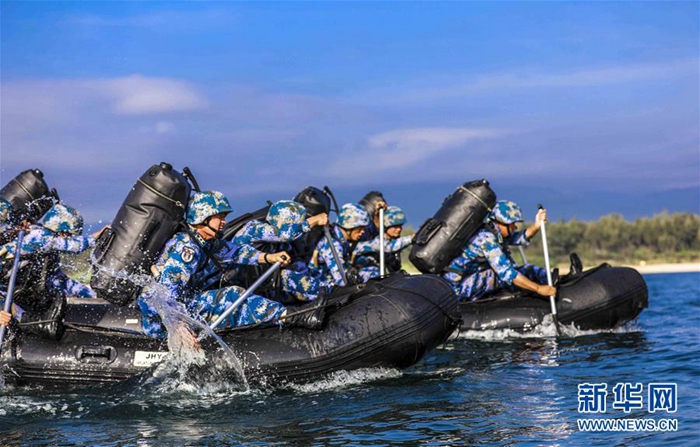 海軍陸戰(zhàn)隊某旅偵察營在三亞某海域開展劃舟訓(xùn)練(11月20日攝)。新華社發(fā)(范旭東 攝)