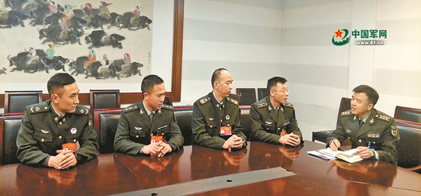 ????解放軍報(bào)記者孫興維(右一)采訪軍隊(duì)人大代表?xiàng)畛醺裎鳌罾?、齊虎廣、謝正誼(左一至左四)。尹繼冬 攝