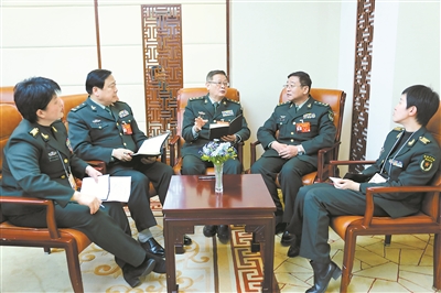 本報記者鄒維榮(左一)、柴華(右一)采訪軍隊政協(xié)委員曲新勇、王健、吳剛(左二至左四)。中國軍網記者 孫智英 攝