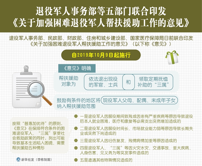 新華社北京10月21日電(記者梅世雄)退役軍人事務(wù)部、民政部、財政部、住房和城鄉(xiāng)建設(shè)部、國家醫(yī)療保障局日前聯(lián)合印發(fā)《關(guān)于加強困難退役軍人幫扶援助工作的意見》(以下稱《意見》),自2019年10月9日起施行。