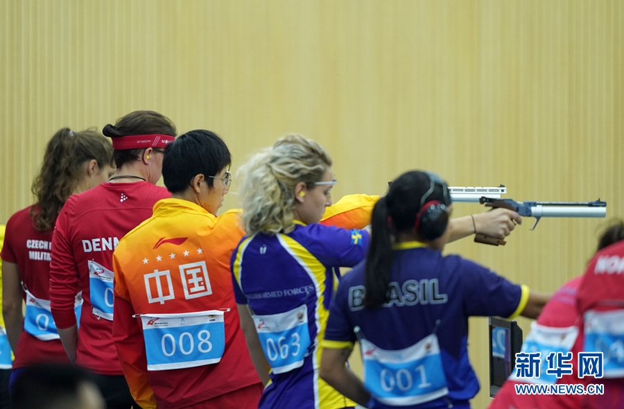 10月21日,中國隊選手王佳(左三)在比賽中。 當(dāng)日,在武漢舉行的第七屆世界軍人運動會空軍五項女子射擊比賽中,中國隊選手王佳獲得第一名。 新華社記者金良快攝