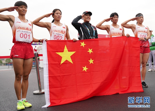 10月23日,中國隊(duì)成員在女子個(gè)人全能越野跑比賽后手持國旗敬禮。當(dāng)日,第七屆世界軍人運(yùn)動(dòng)會(huì)女子個(gè)人全能項(xiàng)目比賽在武漢陸軍工程大學(xué)軍械士官學(xué)校結(jié)束,中國選手盧嬪嬪以5627.2分的總成績(jī)獲得冠軍,隊(duì)友管超楠以5567.6分的總成績(jī)獲得亞軍,王堂林以5506.3分的總成績(jī)獲得季軍,孫洪燕以5474.1的總成績(jī)獲得第四名。新華社記者 王建威 攝