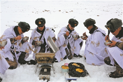 ????寒冬時節(jié),新疆喀什軍分區(qū)克克吐魯克邊防連官兵在巡邏途中吃上熱乎乎的飯菜。姬文志 攝