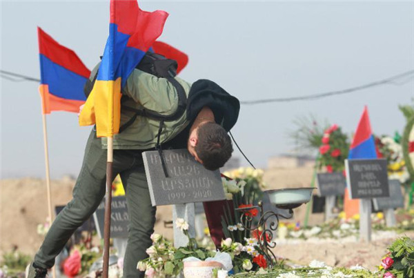 ????資料圖片:在亞美尼亞首都埃里溫一處公墓,當?shù)孛癖姲苍嵩诩{卡沖突中陣亡的士兵