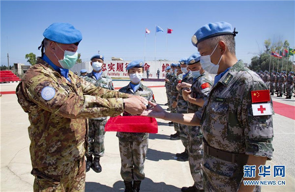 ????6月16日,中國第18批赴黎巴嫩維和部隊(duì)全體410名官兵被授予聯(lián)合國勛章,以表彰他們?cè)谌蝿?wù)期內(nèi)為維護(hù)黎巴嫩南部地區(qū)和平與穩(wěn)定做出的突出貢獻(xiàn)。新華社發(fā)(彭希 攝)