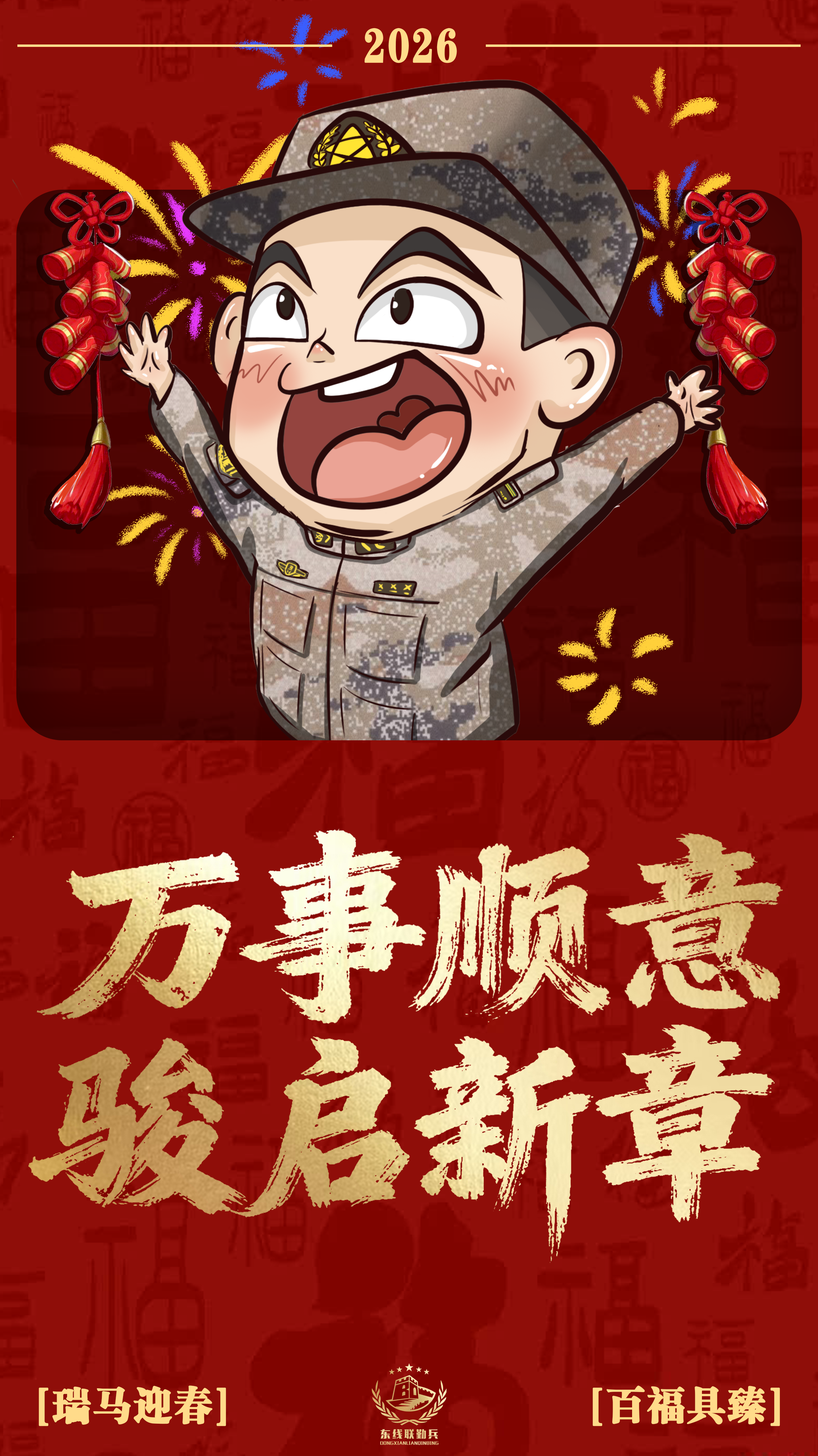 2026瑞马迎春,戎装焕彩贺新春!看兵哥哥卡通形象燃动年味,放鞭炮、舞醒狮,展军旅豪情。“马跃新程” 踏山海,“快马逐风” 启华章。东部战区联勤官兵携六重祝福,祝大家马年万事顺意、事业长虹,马行千里不负韶华,岁岁平安喜乐长安! (策划:赵若昕 董浩 形象设计:叶子民)