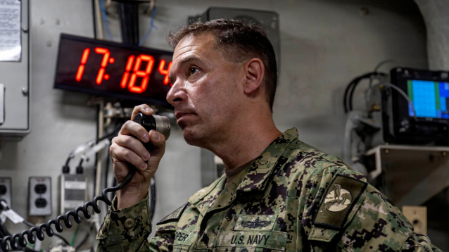 美国中央司令部司令布拉德·库珀2月7日在美军航空母舰上发表讲话 资料图片
