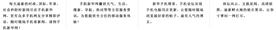 手機(jī)新華網(wǎng)是新華網(wǎng)的手機(jī)無線門戶網(wǎng)站,是中國最具權(quán)威的免費手機(jī)新聞網(wǎng)站之一。歡迎各地電信運營商以及廣告界、企業(yè)界、商務(wù)界、傳媒界等各界人士與我們聯(lián)系,精誠合作,實現(xiàn)共贏。電話:010-63070908,E-mail:xhsjb@xinhuanet.com