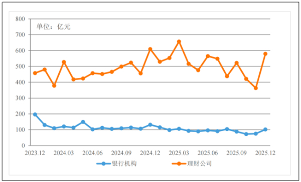 从理财产品类型结构来看,截至2025年末,公募理财产品存续规模31.46万亿元,占全部理财产品存续规模的94.50%,占比较年初减少0.42个百分点;私募理财产品存续规模1.83万亿元,占全部理财产品存续规模的5.50%。