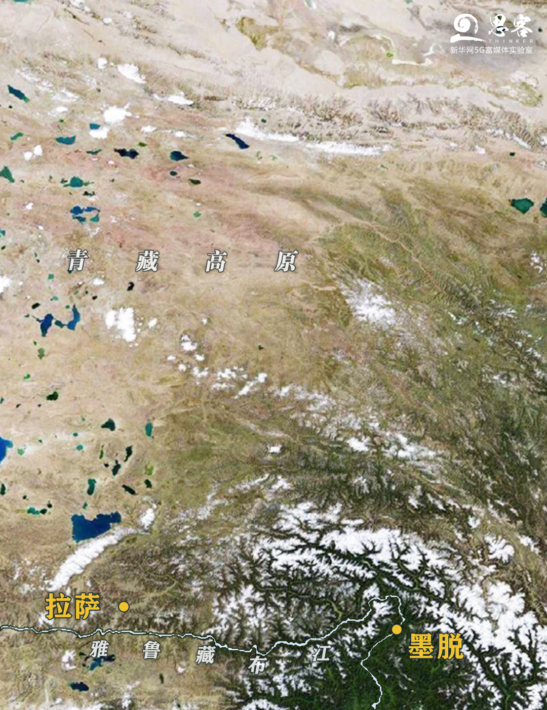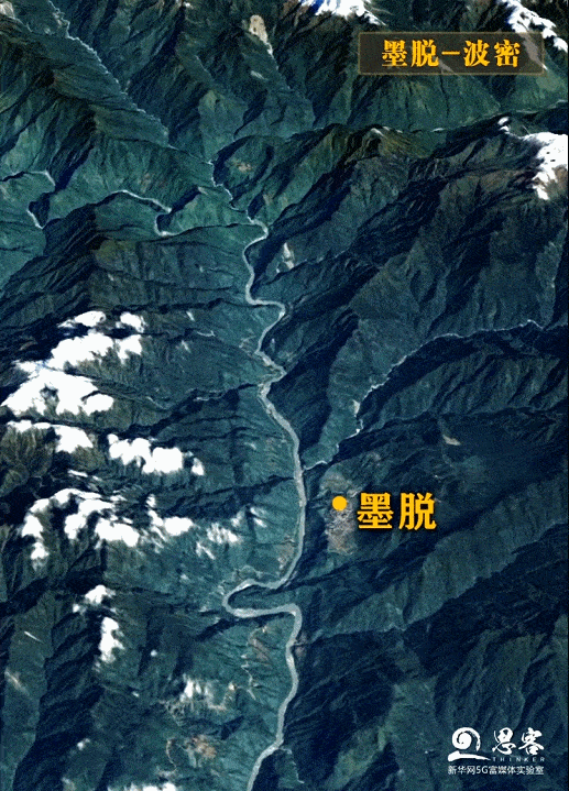 ▲從墨脫至波密縣扎木鎮(zhèn)衛(wèi)星三維實(shí)景。衛(wèi)星數(shù)據(jù)來源:高分六號(hào)