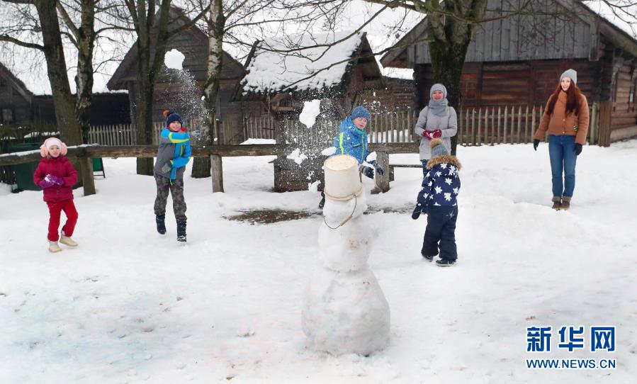 1月24日,孩子們在白俄羅斯首都明斯克郊區(qū)的民族建筑博物館內打雪仗。新華社發(fā)(任科夫攝)