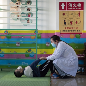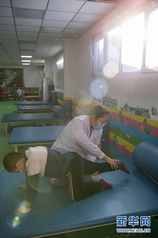 在哈爾濱博能中醫(yī)門診部,劉雨晴為腦癱兒童進行康復(fù)訓(xùn)練(2月2日攝)。