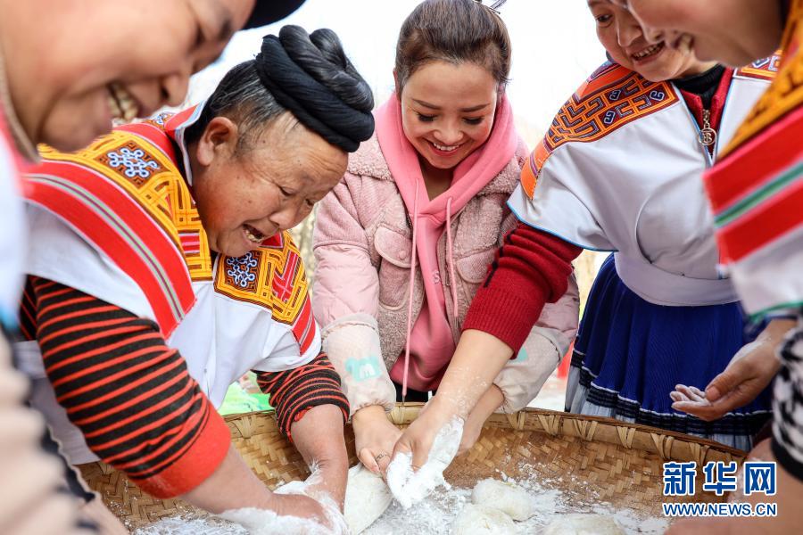2月10日,吳窮(中)和坪子社區(qū)村民一起制作糍粑。