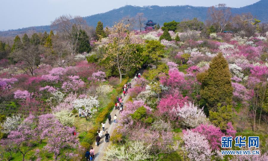 2月14日,游人在南京梅花山賞花(無人機照片)。新華社發(fā)(蘇陽 攝)