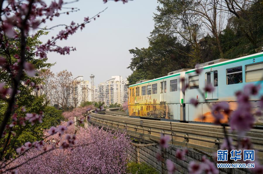 2月23日,在重慶軌道交通2號線佛圖關(guān)段,一列單軌列車穿越花海奔馳而過。