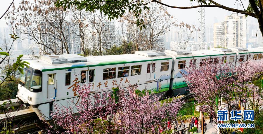 初春時節(jié),重慶氣溫逐漸回暖,暖陽里的山城春意盎然。在重慶軌道交通2號線佛圖關段,山城步道上的梅花簇簇綻放,單軌列車穿越花海,組成一幅賞心悅目的獨特城市景觀。
