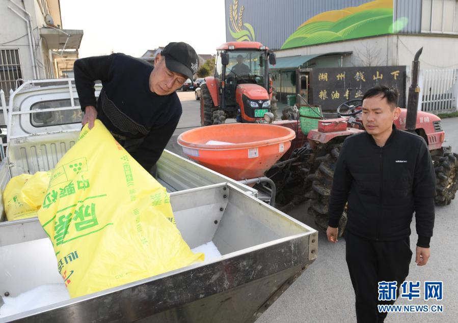 2月23日,湖州錢山下糧油專業(yè)合作社工作人員在農(nóng)機(jī)內(nèi)裝載化肥準(zhǔn)備施肥。立春過后氣溫回升,浙江省湖州市吳興區(qū)道場鄉(xiāng)全力開展春耕工作。今年該鄉(xiāng)計劃播種農(nóng)作物總面積1.2萬畝,其中水稻5000畝、小麥2000畝。新華社記者 翁忻旸 攝