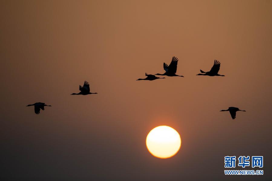 日出時(shí)分,黑頸鶴在大山包黑頸鶴國(guó)家級(jí)自然保護(hù)區(qū)飛翔(2月27日攝)。新華社記者 胡超 攝