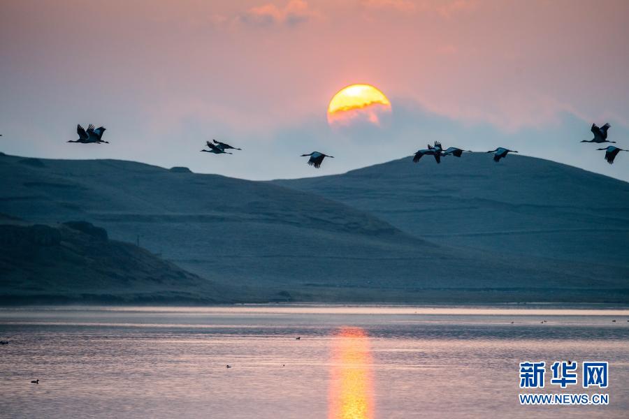 日出時分,黑頸鶴在大山包黑頸鶴國家級自然保護(hù)區(qū)飛翔(2月25日攝)。新華社記者 胡超 攝