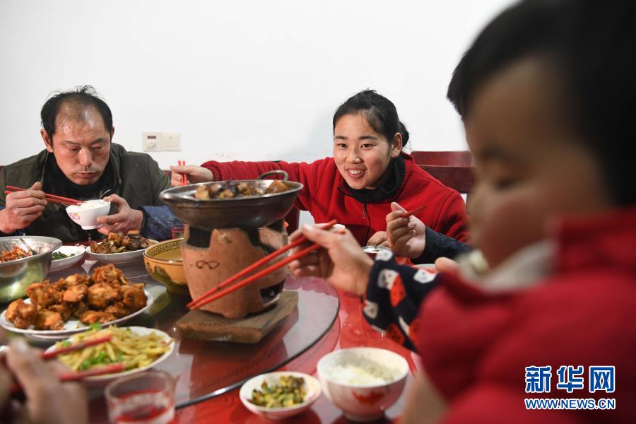 元宵佳節(jié),張志菊(中)和家人一起吃晚飯(2月26日攝)。