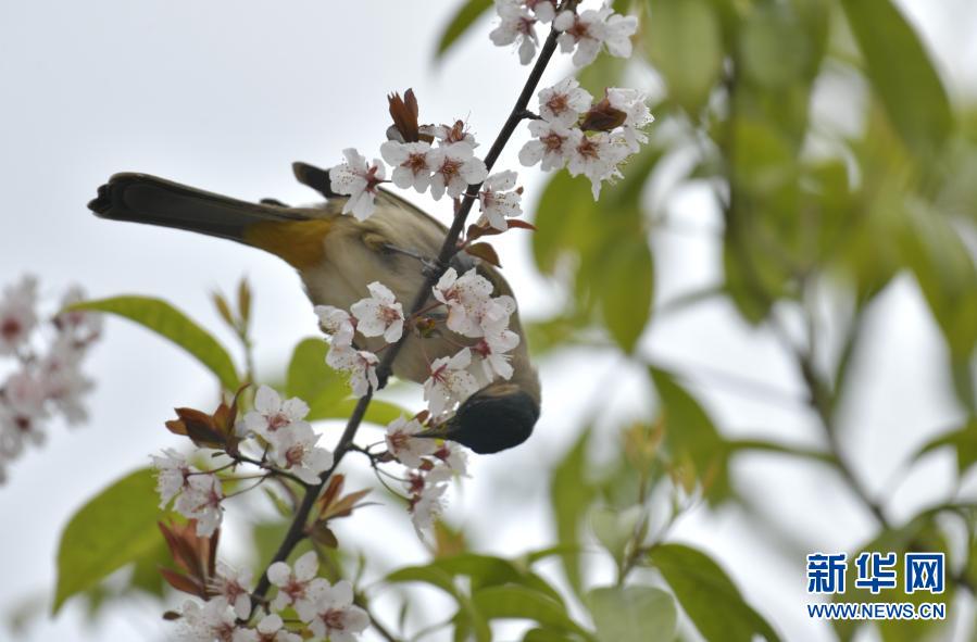 3月2日,在湖北省恩施土家族苗族自治州宣恩縣貢水河國家濕地公園,一只黃臀鵯在花枝上停留。新華社發(fā)(宋文 攝)