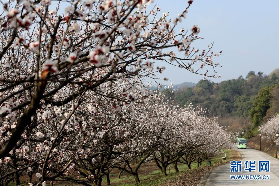 3月2日,一輛觀光車在蘇州上方山國家森林公園內開滿鮮花的小道上前行 。新華社發(fā)(杭興微 攝)