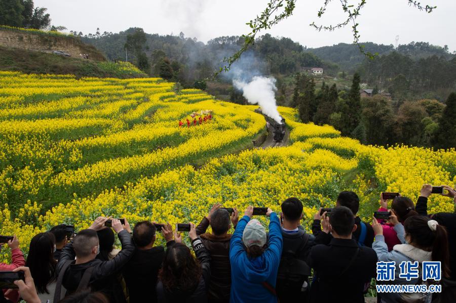3月2日,一列嘉陽(yáng)小火車(chē)經(jīng)過(guò)段家灣蜜蜂巖的油菜花海,吸引眾多游客拍照。