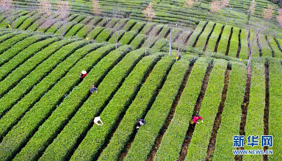 3月4日,茶農(nóng)在安康市漢濱區(qū)流水鎮(zhèn)剛子茶葉專(zhuān)業(yè)合作社標(biāo)準(zhǔn)化茶園采摘新茶(無(wú)人機(jī)照片)。新華社記者 陶明 攝