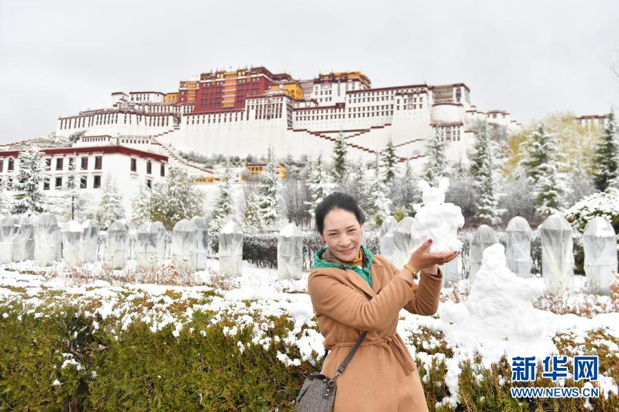 3月14日,在布達(dá)拉宮前,一名路人舉起一個雪人留影。