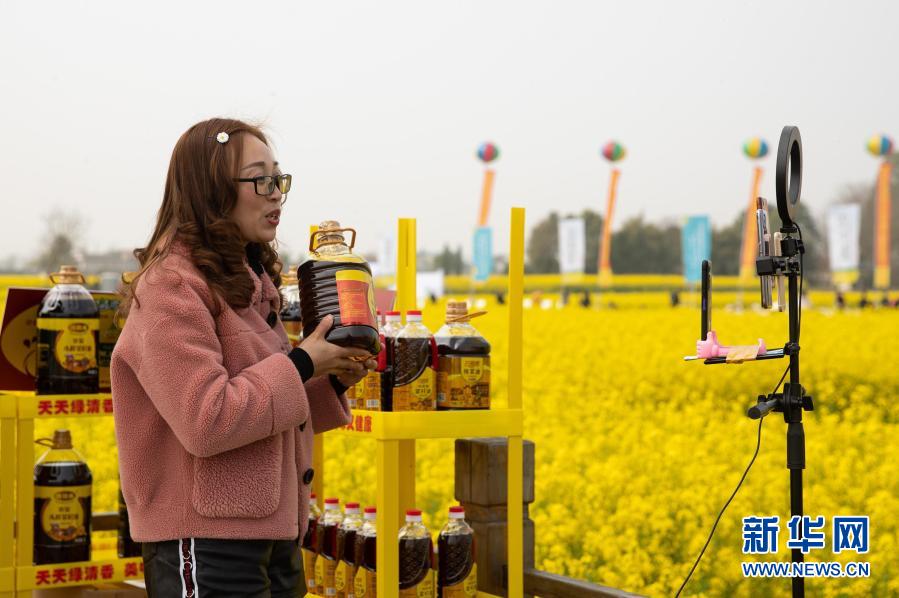 3月14日,在安州區(qū)秀水鎮(zhèn)龍泉村的油菜花海邊,一名企業(yè)員工在直播銷售菜籽油。新華社記者 江宏景 攝