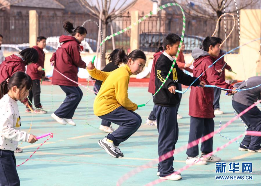 騎路小學(xué)的學(xué)生們?cè)隗w育課上進(jìn)行跳繩鍛煉(3月10日攝)。新華社記者 楊磊 攝