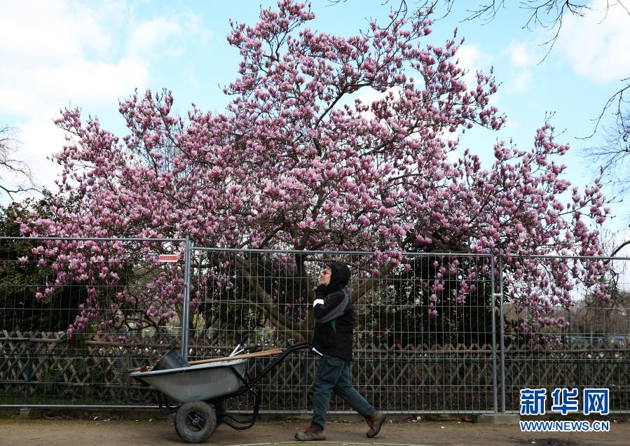 3月19日,在法國巴黎埃菲爾鐵塔腳下的戰(zhàn)神廣場,一名園丁路過玉蘭花。新華社記者高靜攝