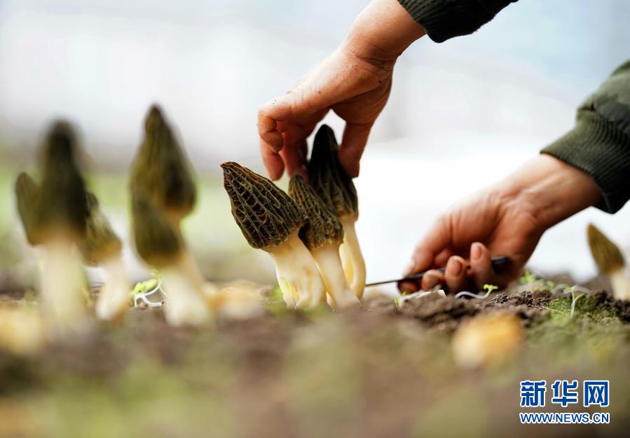 3月20日,河北省唐山市漢沽管理區(qū)農(nóng)業(yè)總公司第九生產(chǎn)隊(duì)的農(nóng)民在大棚內(nèi)采收羊肚菌。