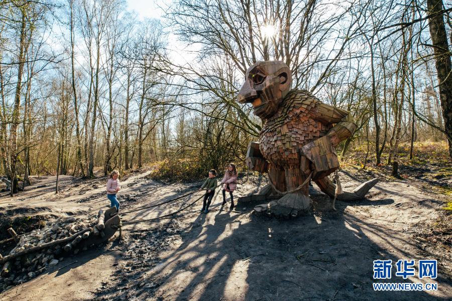 3月20日,孩子們在比利時博姆市的德舒爾森林公園和一座“巨人”雕塑“玩?!?。新華社記者 張鋮 攝