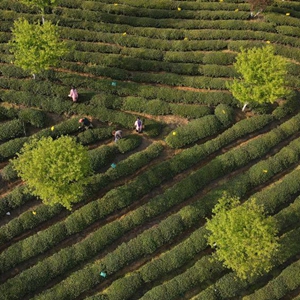 3月24日,茶農(nóng)在黃山毛峰唐模標(biāo)準(zhǔn)化生態(tài)茶園里采茶(無人機(jī)照片)。