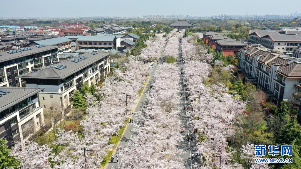 3月26日拍攝的江蘇省揚(yáng)州市鑒真路“櫻花大道”(無(wú)人機(jī)照片)。