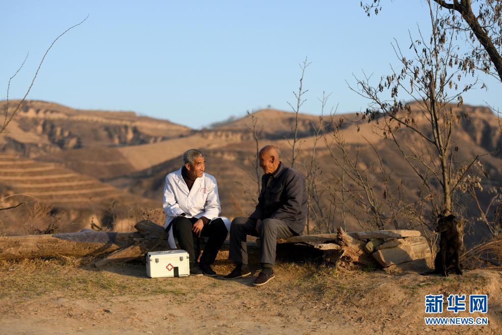 在山西省石樓縣鐵頭村張家灣自然村,張尚保(左)在詢(xún)問(wèn)村民的身體情況(3月23日攝)。新華社發(fā)(劉亮亮 攝)