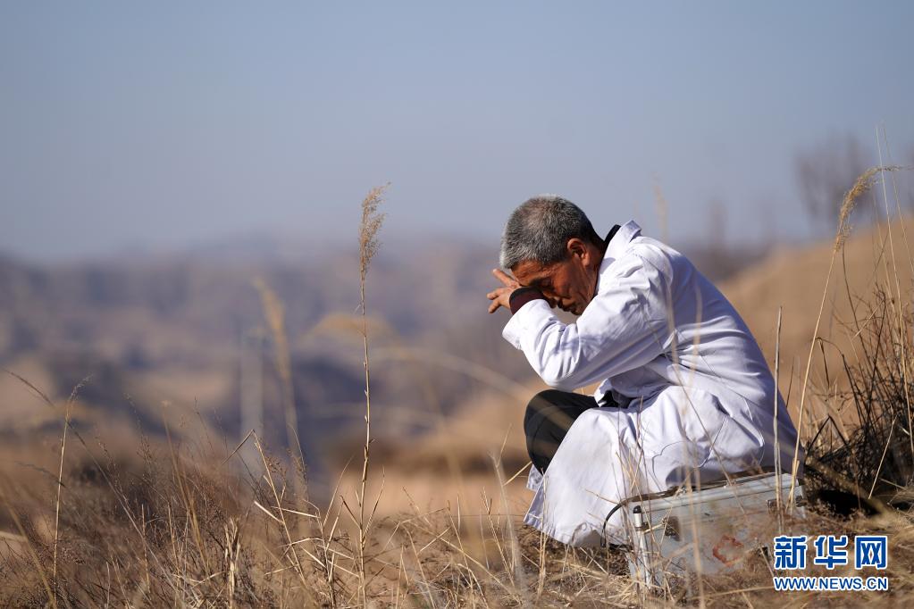 去石樓縣鐵頭村張家灣自然村出診途中,村醫(yī)張尚保在路邊擦汗休息(3月23日攝)。新華社記者 詹彥 攝