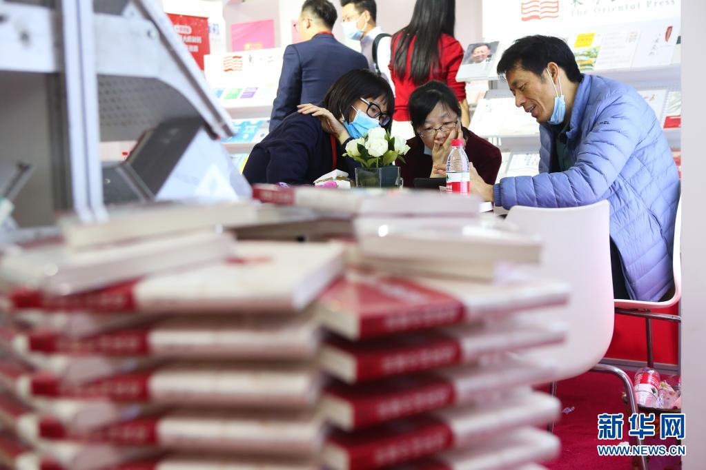 3月31日,參展人員在人民出版社展位交流。