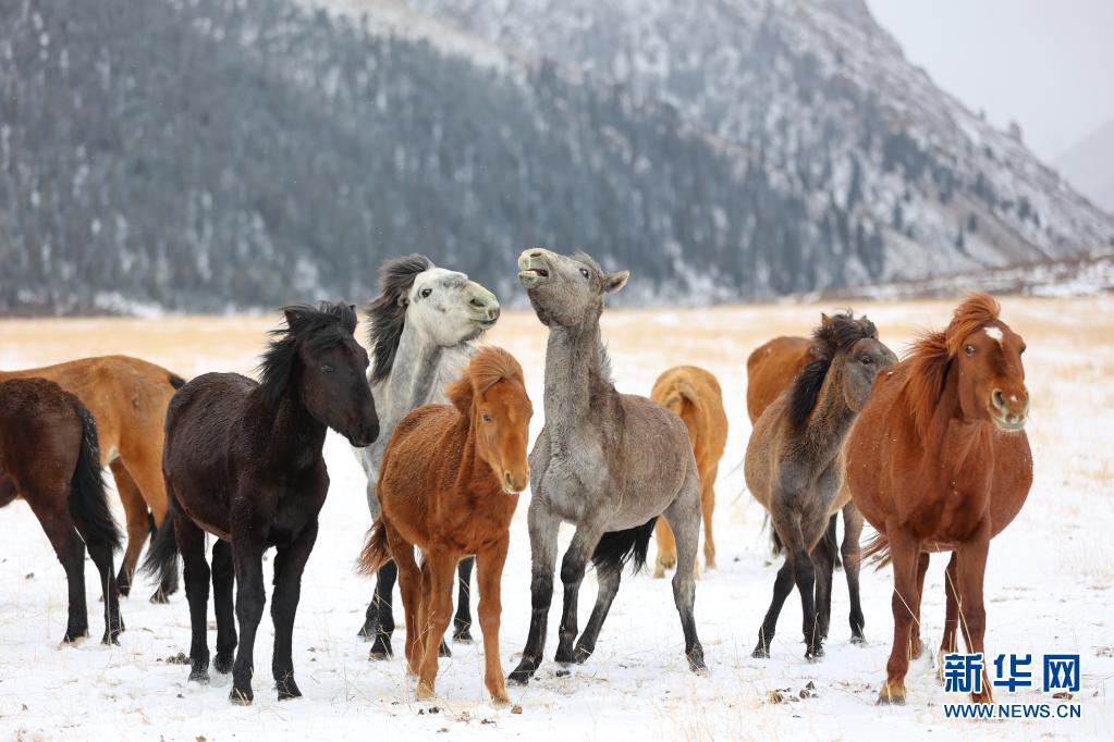 當(dāng)日,受冷空氣影響,位于甘肅省河西走廊中部、祁連山北麓的山丹馬場降雪,馬群在雪原上奔跑覓食,構(gòu)成了一幅壯美高原雪景 。