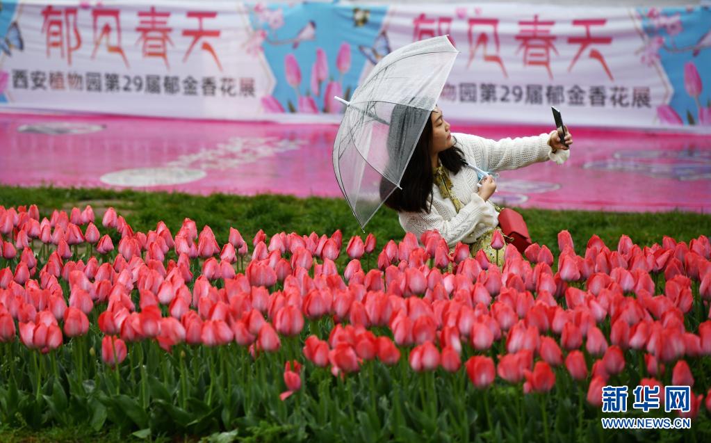 4月1日,游客在西安植物園郁金香展區(qū)自拍。