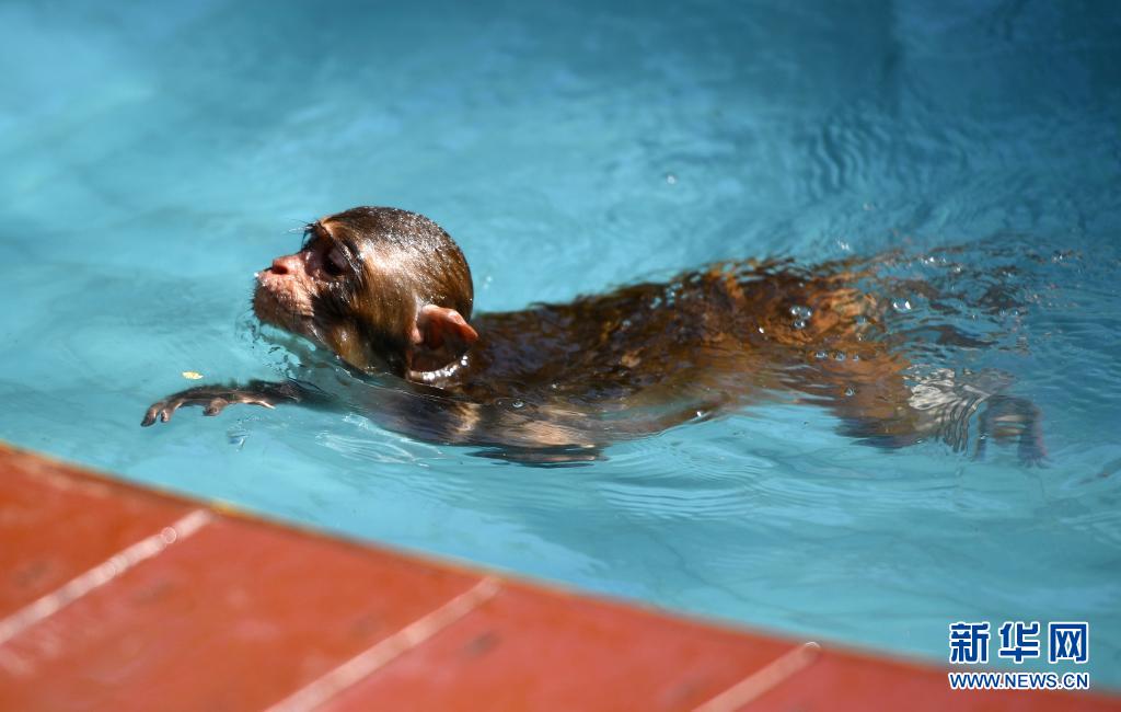 4月4日,獼猴在南灣猴島保護(hù)區(qū)里戲水。