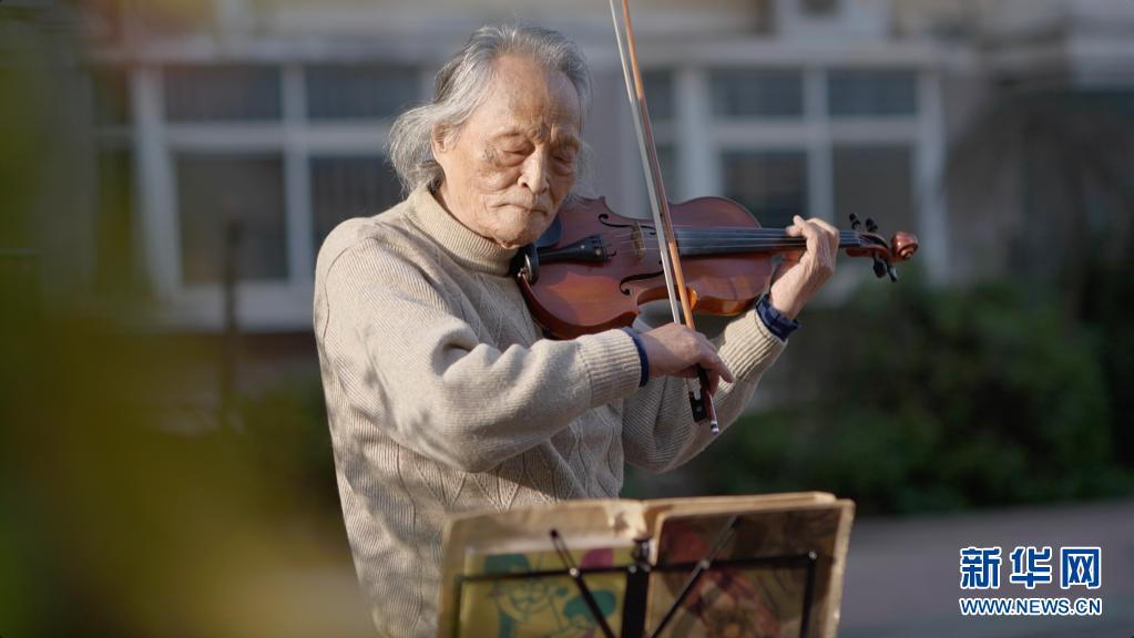 3月24日,“看夕陽的老人”王欣在東西湖區(qū)園藝花城小區(qū)內拉小提琴。新華社記者 熊琦 攝