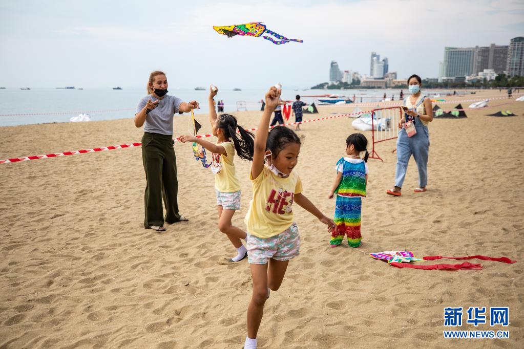4月9日,兒童在泰國芭堤雅海灘上放風(fēng)箏。
