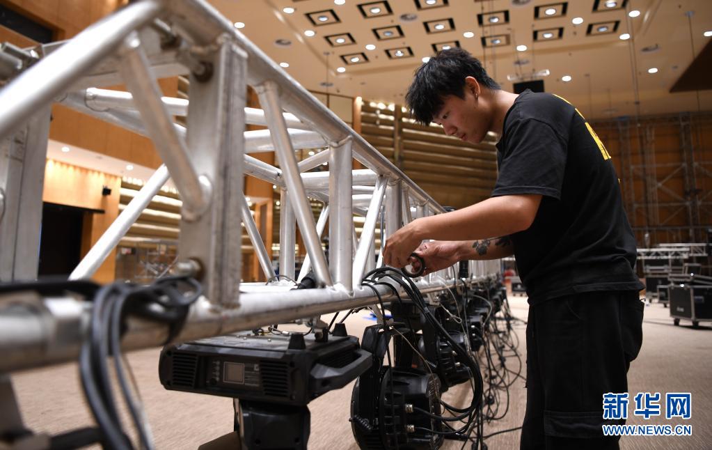 4月10日,工作人員在檢查主會場燈光設(shè)備。