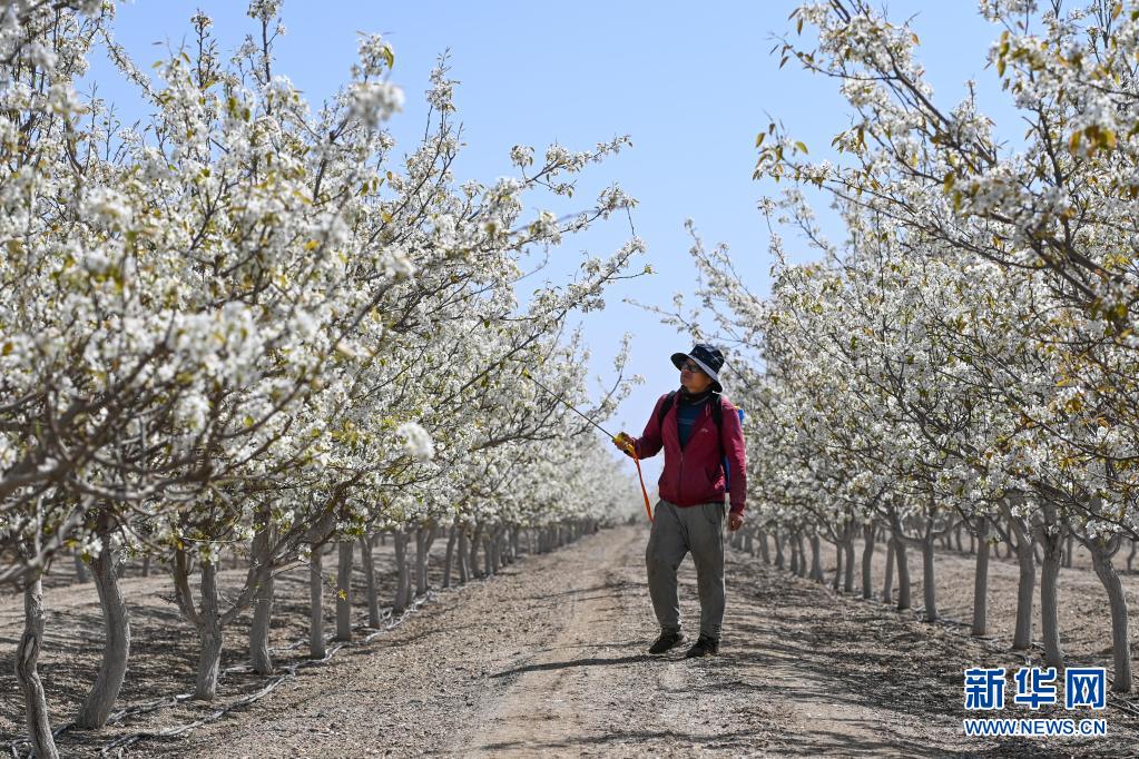 4月11日,在鐵門關市一處梨園,梨農(nóng)為梨花授粉。新華社記者 丁磊 攝