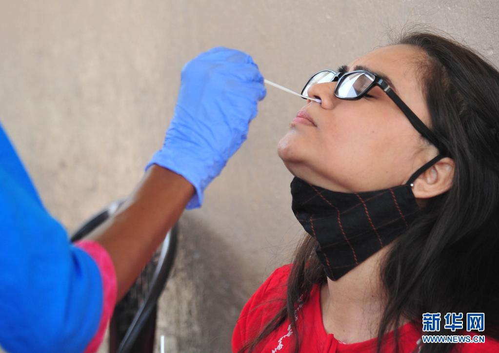 4月11日,一名女子在印度班加羅爾的一個(gè)公交站接受新冠病毒檢測(cè)取樣。