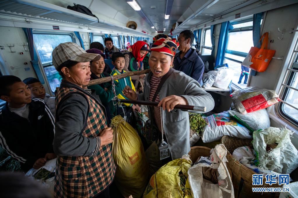 在5633次列車上的“流動集市”,一名彝族婦女(前右)向其他乘客售賣山貨(4月11日攝)。新華社記者 沈伯韓 攝