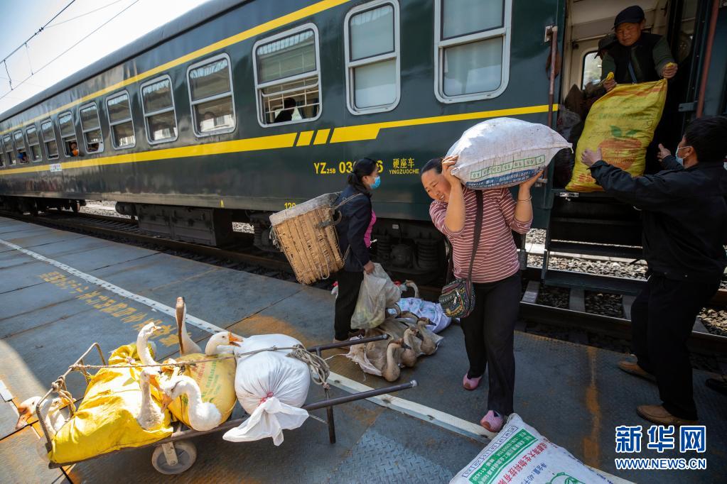 5633次列車??寇囌竞?,彝族小商販忙著把貨卸下來(4月11日攝)。新華社記者 沈伯韓 攝